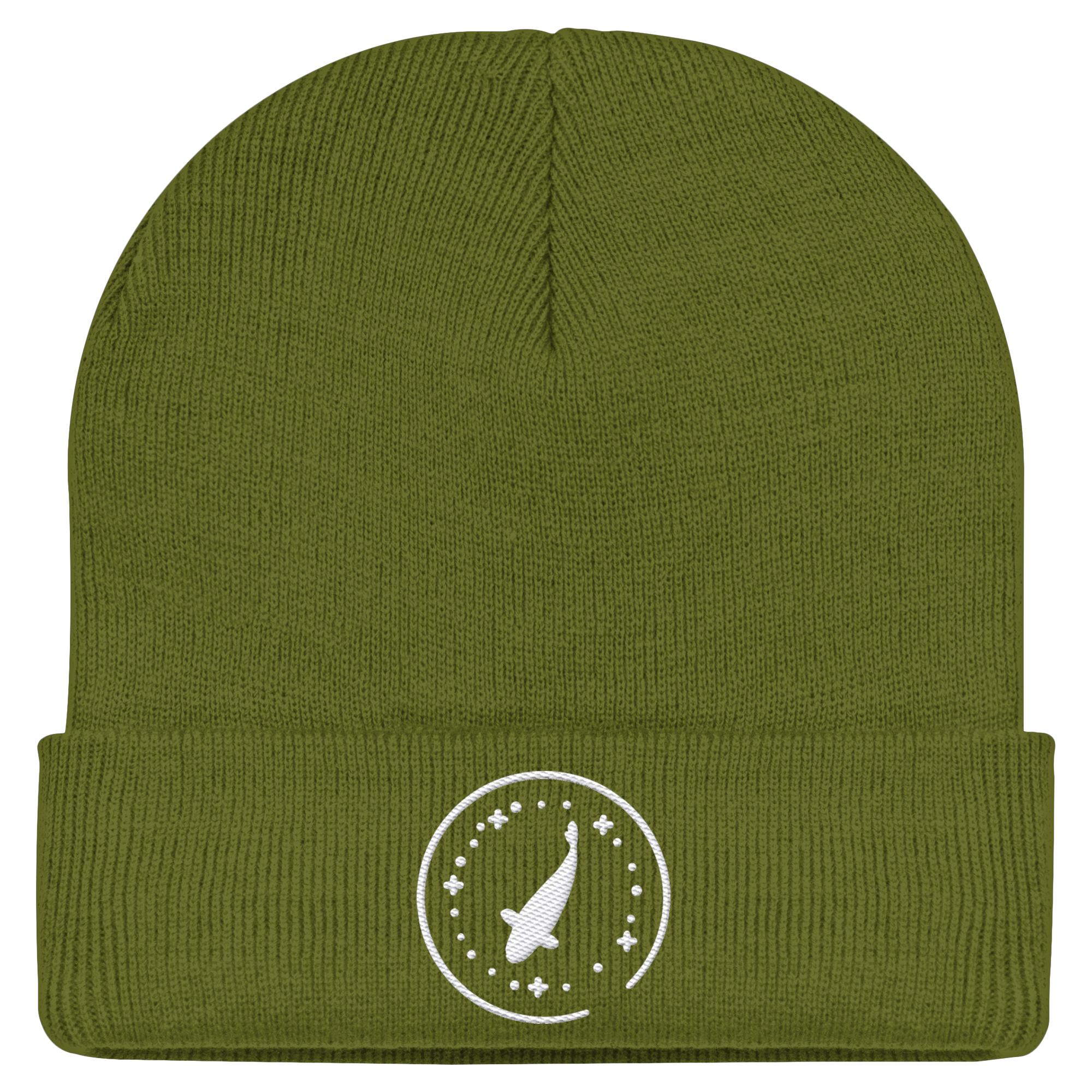 Moon Carp Beanie: olivgrüne Karpfen Mütze für Angler. Die Moon Carp Beanie ist ein tolles Geschenk für Karpfenangler. Beanies für Angler hier bestellen.