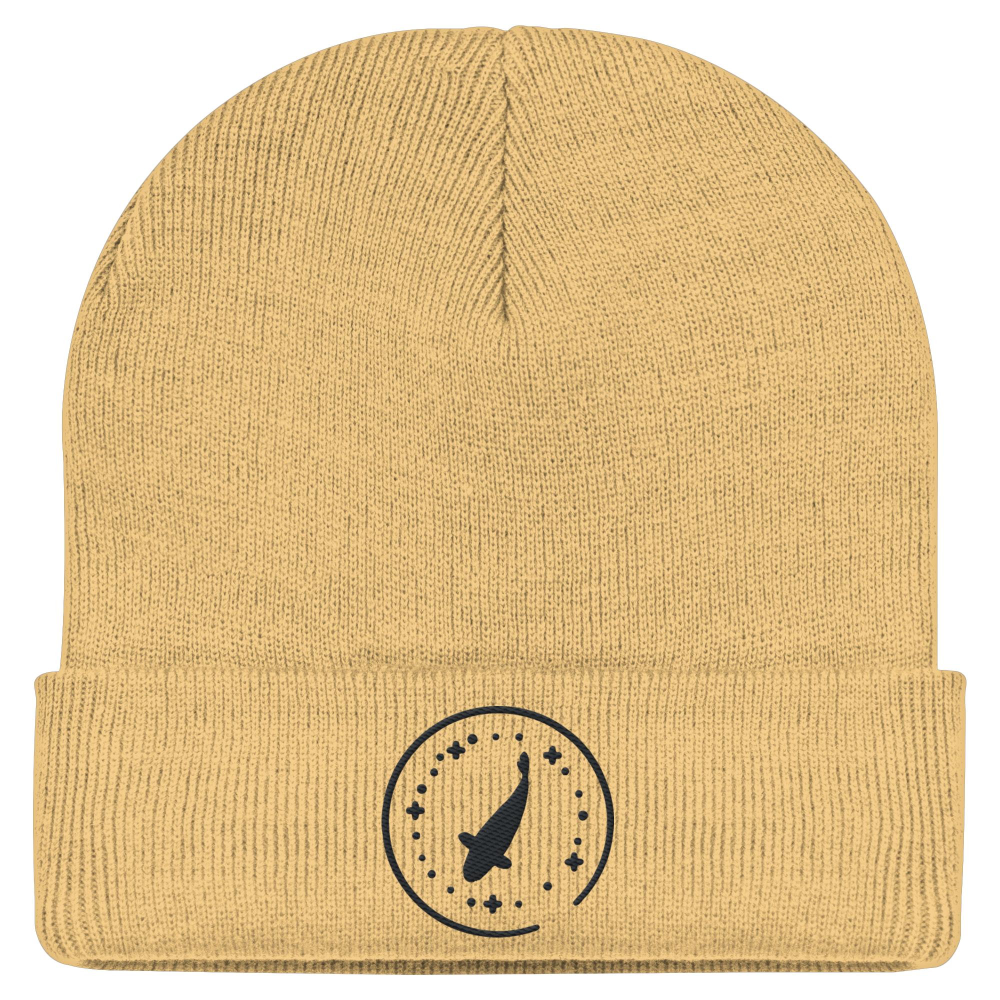 Moon Carp Beanie: sandfarbene Karpfen Mütze für Angler. Die Moon Carp Beanie ist ein tolles Geschenk für Karpfenangler. Beanies für Angler hier bestellen.